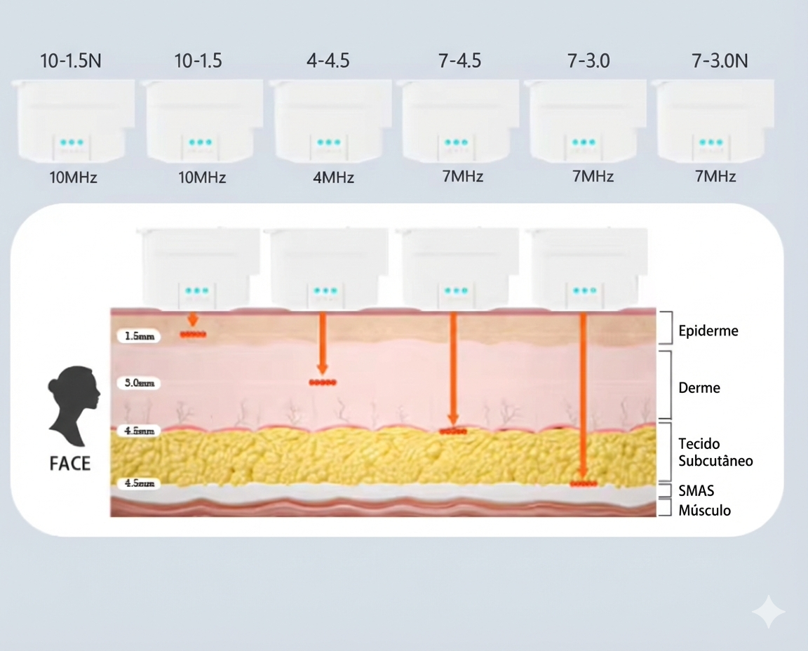 Ação Segmentada em Profundidades Variadas: permite que a energia atue tanto em camadas superficiais (para texturização e redução de linhas finas) quanto profundas (para ligamentação e lifting estrutural), sem cirurgia.